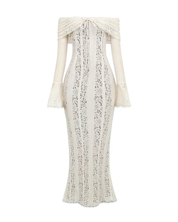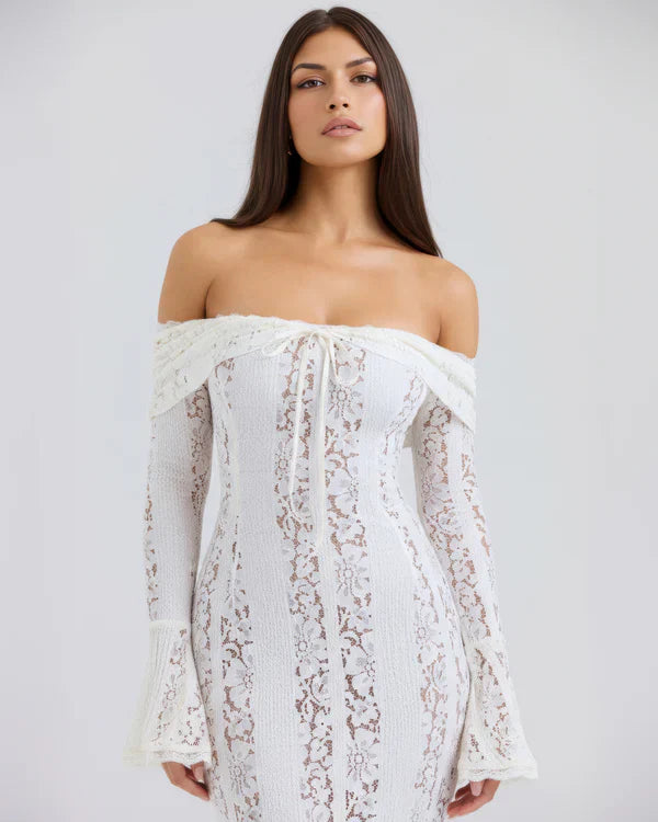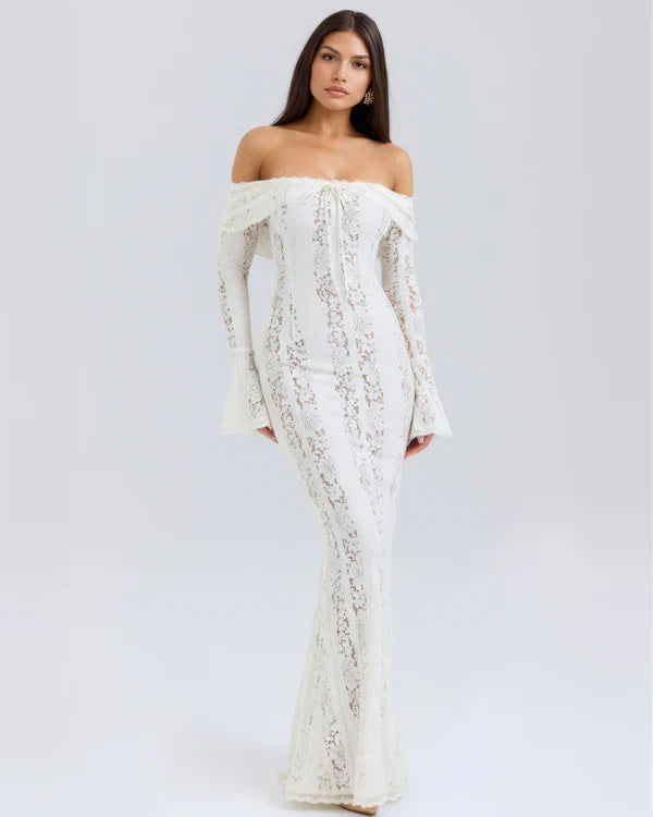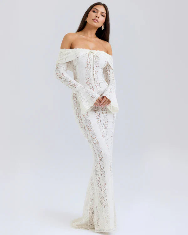 El vestido maxi 'Alessandra' en negro está aquí para deslumbrar. Su encaje floral elástico realza tus curvas a la perfección, con un forro en contraste que aporta un toque de color sutil. El corpiño con hombros descubiertos cuenta con ballenas para mayor sujeción (y un toque extra de glamour), mientras que los puños acampanados le dan un aire sofisticado.