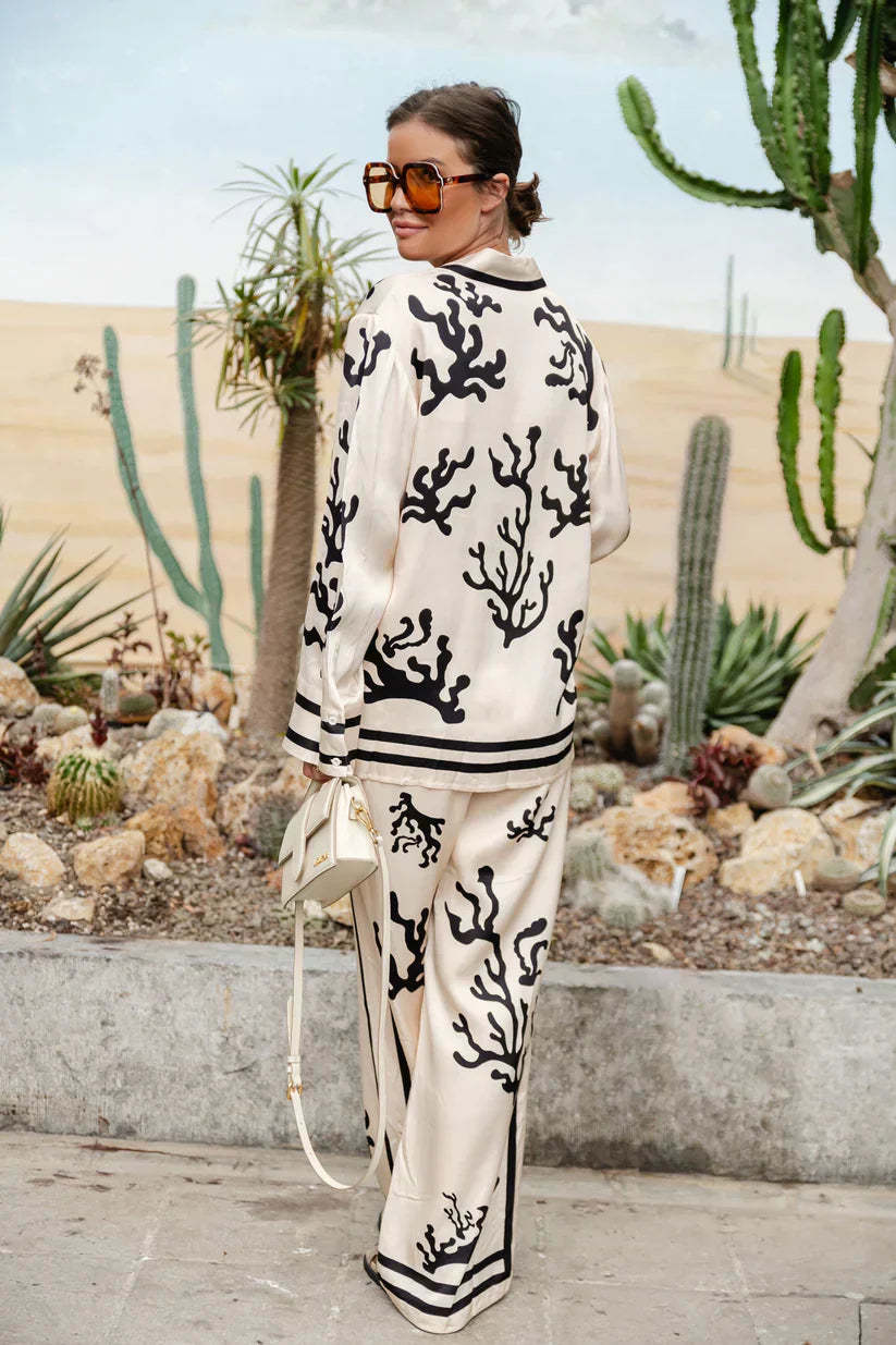 Con su camisa de manga larga con solapa y sus pantalones largos de corte ancho, este conjunto ofrece un equilibrio perfecto entre estilo y comodidad. Hecho en una composición de poliéster y algodón, es la opción perfecta para esos días en los que quieres ir elegante y cómoda.